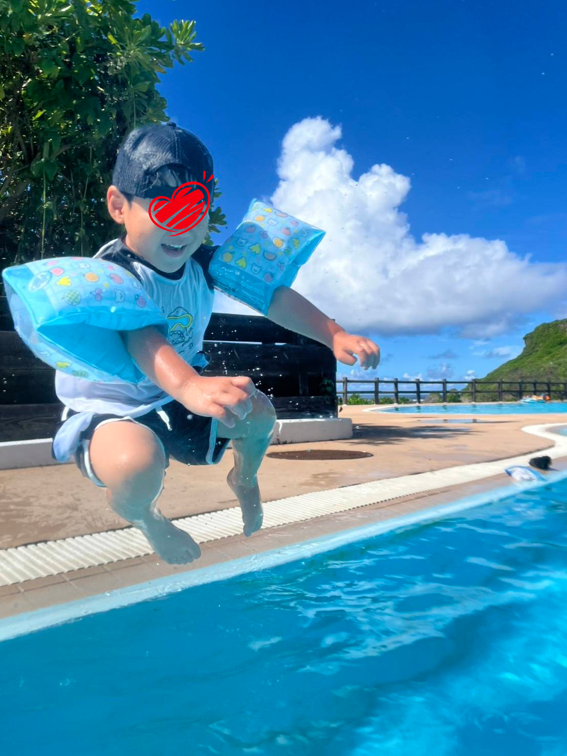 写真のように、プールでも怖がることなく勢いよく飛び込む姿は、まるで小さな冒険家。浮き輪やアームリングをしっかりつけていても、水に飛び込む瞬間のあの笑顔は、何ものにも代えがたい輝きです。大人の私たちからすると少しヒヤッとする場面もありますが、本人にとっては挑戦と楽しさにあふれた瞬間。そんな姿を見ていると、子どもの無限のエネルギーに驚かされると同時に、成長を実感します。