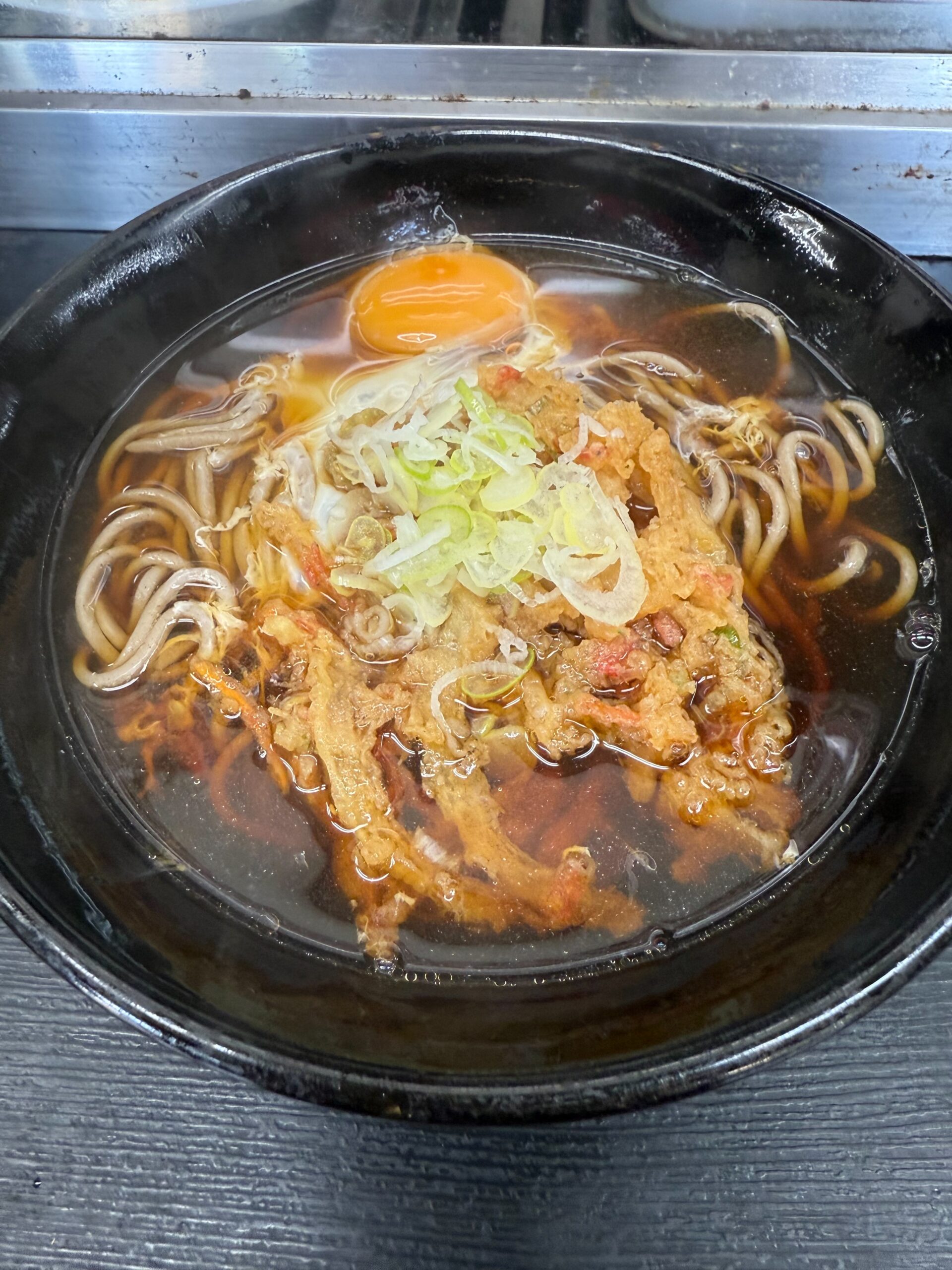 目の前に運ばれてきたのは、熱々のつゆに浸った蕎麦。その上に堂々と鎮座する大きなかき揚げ、そして仕上げに生卵がポトリと落とされ、ネギがたっぷりと散らされています。見た瞬間に「これは絶対うまい」と確信できるビジュアル。